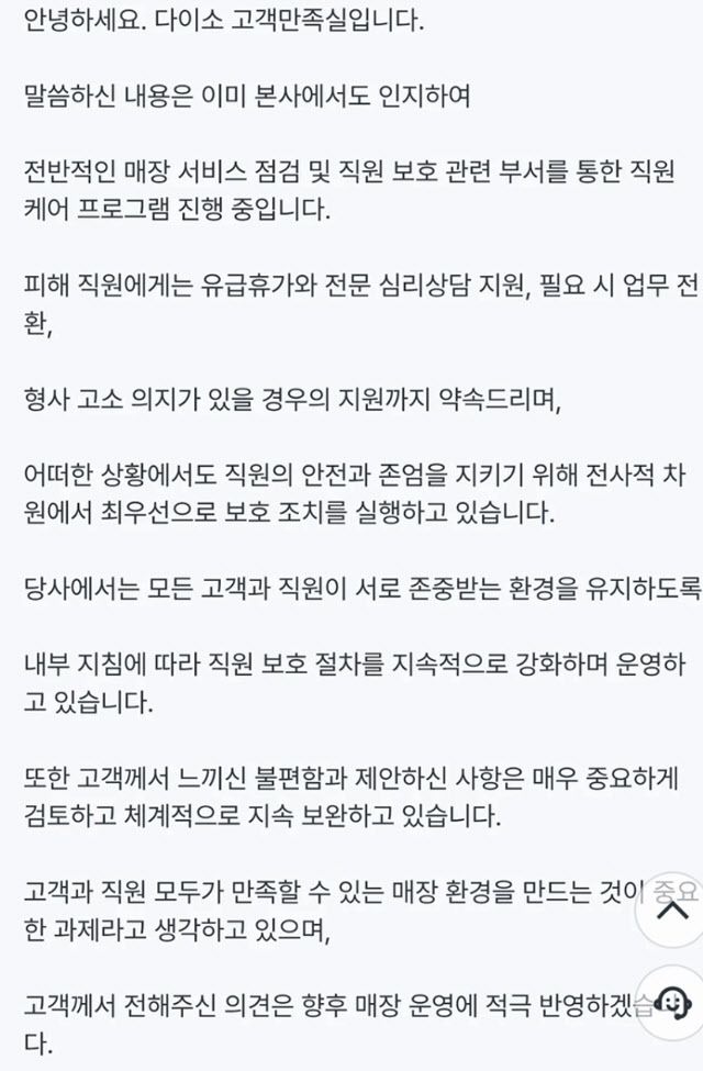 앞서 “피해 직원에게 유급 휴가를 부여하고 심리 상담을 지원하겠다”며 “형사 고소 의사가 있을 경우 법적 지원에 나서겠다”고 밝힌 고객만족실 답변글이 온라인을 통해 공유됐다.