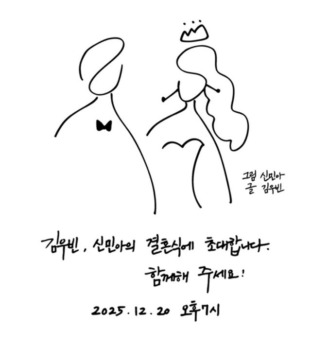 공개된 청첩장에는 ‘그림 신민아 글 김우빈’이라는 글과 함께 신랑, 신부의 모습이 그림으로 표현돼있다.
