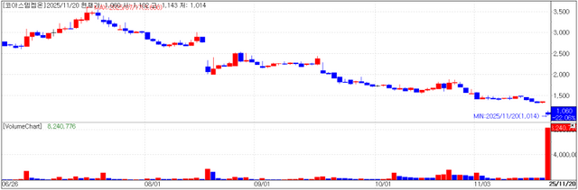 코아스템켐온(166480)은 이날 장이 열리자마자 하락세를 보이다 전일 대비 300원(22.06%) 급락한 1060원에 장을 마쳤다.