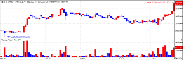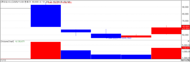 The company, which listed on the KOSDAQ on November 13, made a dramatic debut—finishing its first day at 88,000 won, four times its IPO price of 22,000 won (“da-da-bbul”). But the stock pulled back sharply over subsequent sessions, dropping to 61,600 won, then 53,800 won on November 17 and 45,650 won on November 18. It rebounded to 49,050 won on November 19 before today’s sharp jump.