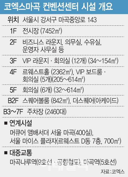 서울 서부권 1호 전시컨벤션센터인 코엑스마곡은 개장 전부터 뛰어난 입지조건으로 주목받았다. 지하철 5호선(마곡역)과 9호선(마곡나루역), 공항철도가 모두 지나가는 ‘트리플 역세권’에 위치한 센터는 인근에 호텔(머큐어), 공연장(LG아트센터), 공원(서울식물원), 미술관(스페이스K), 지하 아케이드(더스퀘어) 등 삼성동 코엑스에 버금가는 인프라를 갖췄다. 센터가 개관한 지난해 11월 말 이후엔 인근 식당, 카페 등 상점들의 하루 매출이 최대 80% 넘게 급증하며 화제가 됐다.