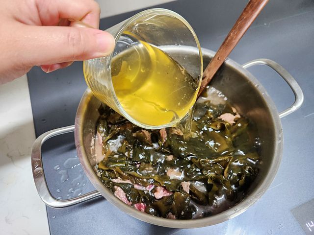 미역을 불릴 때 사용했던 물을 그대로 한컵 넣어주세요.