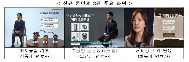 3편의 콘텐츠는 △‘일반인을 위한 하도급법 기초 다지기-하도급법의 기본 개념과 주요 내용’ △‘기업실무자를 위한 부당한 공동행위(담합) 기초 다지기-대표적인 유형과 사례 중심으로’ △‘기업실무자를 위한 거래상지위남용 기초 다지기-대표적인 유형과 사례 중심으로’ 등이다.