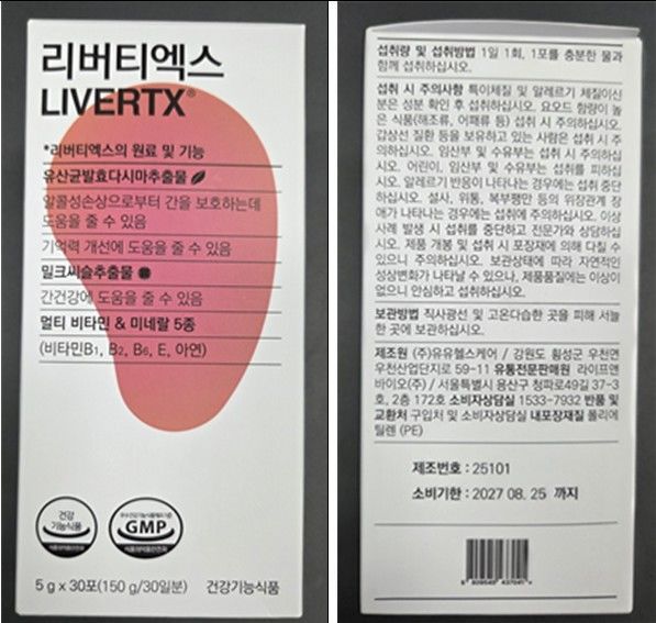 뉴시스 보도에 따르면, 식약처는 건강기능식품 전문제조업체인 유유헬스케어가 제조한 '리버티엑스'에서 비소가 기준치보다 초과 검출돼 전날 해당 제품을 판매 중단하고 회수 조치한다고 28일 밝혔다.