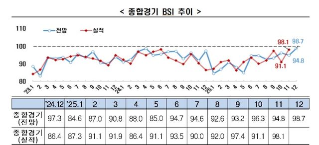 12월 조사 부문별 BSI는 내수(98.1)·수출(97.3)·투자(95.0)를 비롯한 전 부문에서 부정 전망이 나타났다.