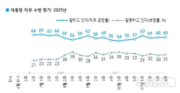 뉴시스 보도에 따르면, 한국갤럽이 지난 25~27일 전국 만 18세 이상 유권자 1000명을 대상으로 조사한 결과 이재명 대통령의 직무 수행 긍정평가는 60%, 부정 평가는 31%로 각각 나타났다. 9%는 의견을 유보했다.
