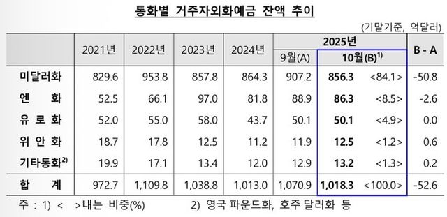 28일 한국은행(이하 한은)이 발표한 '10월 중 거주자 외화예금 동향'에 따르면 지난달 말 외국환은행의 거주자 외화예금 잔액은 1018억3000만달러로 전월 대비 52억6000만달러 줄었다.