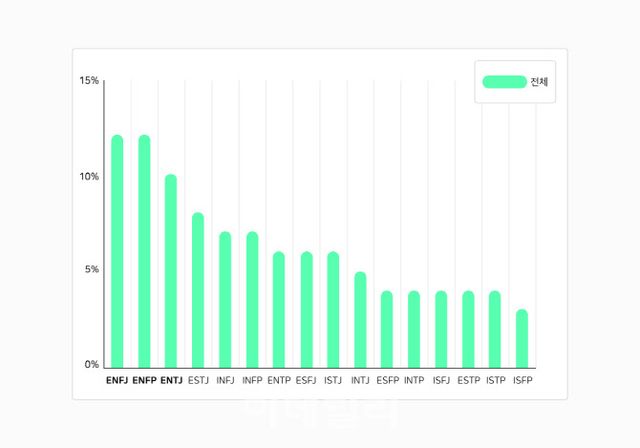 MBTI 유형은 ENFJ, ENFP, ENTJ가 가장 높은 비중을 차지했으며, 해당 유형은 주로 가수·기업인·온라인콘텐츠창작자 직업군에 특히 많이 분포하는 것으로 나타났다.