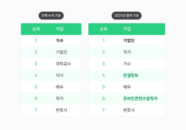 가장 많이 등록한 직업군은 기업인이었다. 그다음으로 2위는 작가, 3위는 가수, 4위는 컨설턴트, 5위는 배우, 6위는 크리에이터, 7위는 변호사였다.