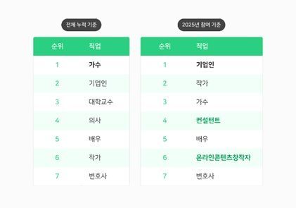 특히 MBTI도 입력할 수 있는데 ENFJ, ENFP, ENTJ가 가장 높은 비중을 차지했다. 해당 유형은 주로 가수, 기업인, 온라인콘텐츠창작자 직업군에 특히 많이 분포하는 것으로 나타났다.