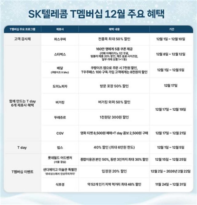 SK텔레콤 윤재웅 Product&Brand 본부장은 고객 의견을 반영한 이벤트와 대규모 혜택을 통해 감사의 마음을 전한다며, 내년에도 고객의 삶에 도움이 되는 T 멤버십 프로그램을 지속적으로 준비하겠다고 밝혔다.