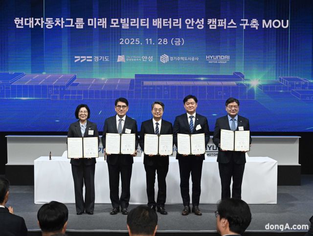 왼쪽부터 김보라 안성시장, 양희원 현대차·기아 R&D본부장, 김동연 경기도지사, 윤종군 안성시 국회의원, 김용진 경기주택도시공사 사장이 28일 경기도 안성시 제5일반산업단지 내에서 ‘미래 모빌리티 배터리 안성 캠퍼스 상량식’에서 배터리 캠퍼스 성공적 구축을 위한 업무협약을 체결하고 있다. 현대차그룹 제공