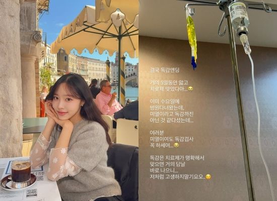 이솔이는 29일 자신의 계정에 "결국 독감 엔딩. 거의 5일 동안 앓고 치료제 맞았다아.. 이미 수요일에 병원 다녀왔는데, 미열이라고 독감까진 아닌 것 같다셨는데..."라며 수액을 맞는 사진을 공개했다.