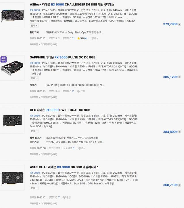 이러한 흐름 속에서 25년 11월의 그래픽카드 시장은 불과 1년 전과 비교해 완전히 다른 양상을 보인다.