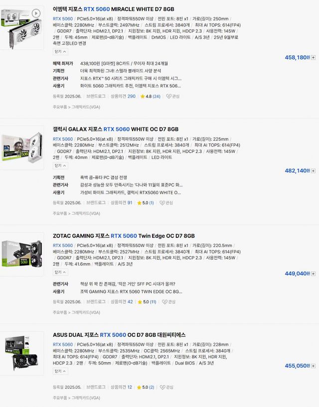 경쟁사의 동급 라인업을 찾아본다면, 지포스 RTX 5060 시리즈가 역시 살짝 높은 가격대에 있지만 비교되는 구도라는 것. 서로 다른 아키텍처·드라이버·최적화 특성을 갖고 있음에도 소비자 입장에서 비교와 선택이 더욱 직접적으로 이루어지게 한다. 그렇기에 게이머 입장에서는 “어떤 제품이 더 나은 선택인가?”라는 질문을 던지는 것은 자연스러운 흐름이다. 특히 그래픽카드 기준 구매 예산이 약 40만 원 선이라는 가정에서는 오히려 비교 욕구를 강화한다.