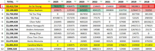 배드민턴 전문매체 '트래커 MS/WS'는 30일(한국시간) 사회관계망서비스(SNS)를 통해 2018년부터 2025년까지 진행된 세계배드민턴연맹(BWF) 월드투어에서 상금을 가장 많이 벌어들인 선수 12명을 소개했다.