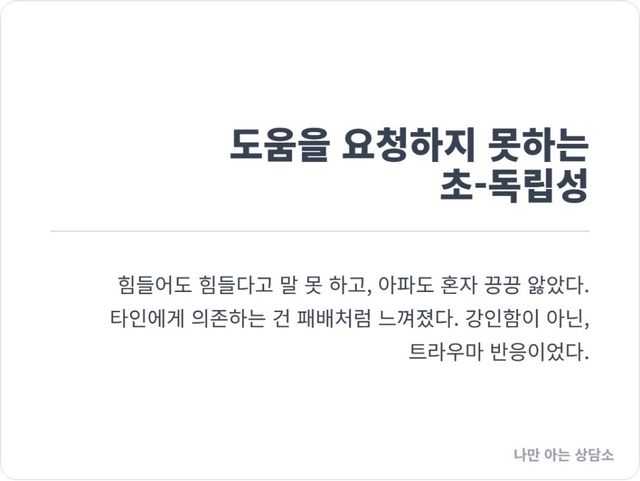 거짓 성숙한 아이들이 어른이 되어 겪는 가장 큰 문제는, 타인에게 의존할 줄 모른다는 것이다. 당신은 힘들어도 힘들다고 말하지 못한다. 아파도 혼자 끙끙 앓는다. 누군가에게 도움을 청하는 것은 당신에게 패배나 민폐처럼 느껴진다. 당신은 모든 문제를 혼자 해결해야 한다는 강박적인 초-독립성(Hyper-independence)을 보인다.