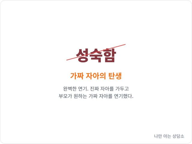살아남기 위해 당신은 ‘진짜 자아’를 무의식의 지하실 깊숙한 곳에 가두고, 부모가 원하는 모습으로 조각된 가짜 자아(False Self)’를 연기하기 시작한다. 완벽한 모범생, 말 잘 듣는 딸, 불평 없는 아들. 당신은 자신의 감정을 느끼는 법을 잊어버렸다. “난 괜찮아”가 입버릇이 되었고, 타인의 기분을 살피는 레이더는 비정상적으로 발달했다.