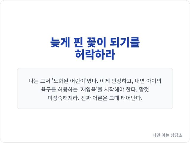 당신은 너무 일찍 어른이 되느라, 아이가 될 기회를 놓쳤다. 이제라도 늦지 않았다. 맘껏 미성숙해져라. 비바람을 맞고, 흔들리고, 꺾이기도 해라. 그 늦은 성장통을 겪고 난 뒤에야, 당신은 비로소 단단한 뿌리를 가진 진짜 어른으로 다시 태어날 것이다.