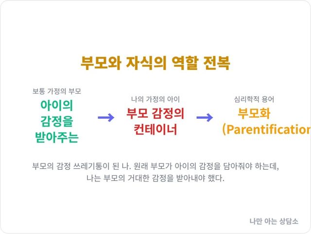 당신은 아마 아주 어릴 때부터 엄마의 하소연을 들어주는 상담사였거나, 아빠의 화를 받아내는 샌드백이었을 것이다. 엄마는 어린 당신을 붙잡고 “네 아빠 때문에 내가 못 산다”, “시집살이가 얼마나 고된지 아느냐”며 울분을 토했다.