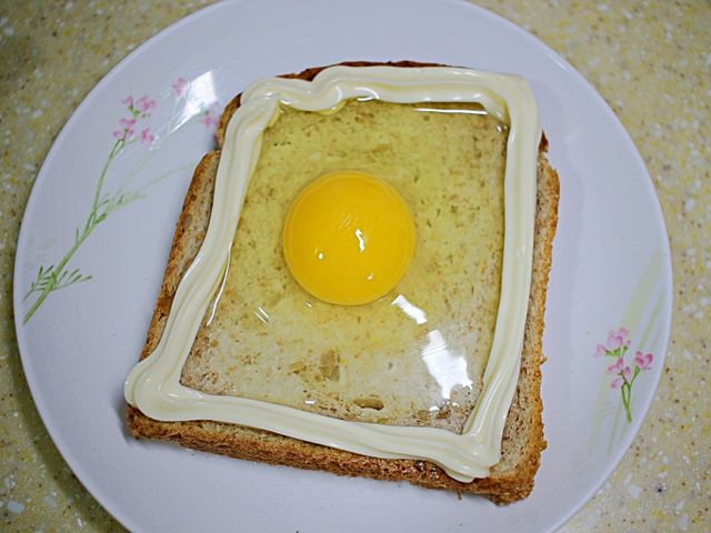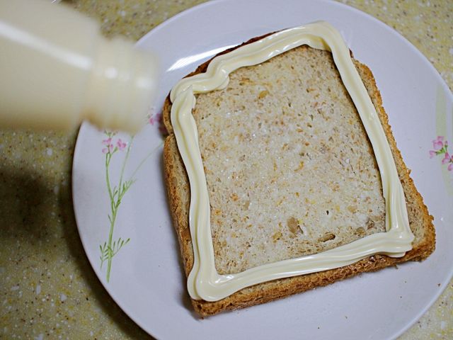 식빵 가장자리를 삥 둘러서 마요네즈를 뿌려주세요.