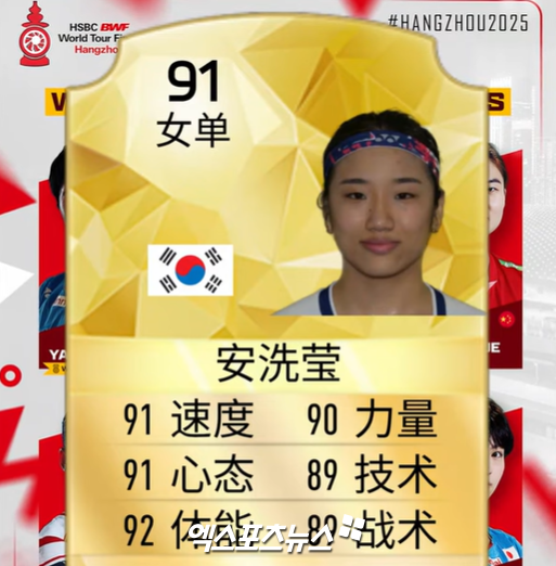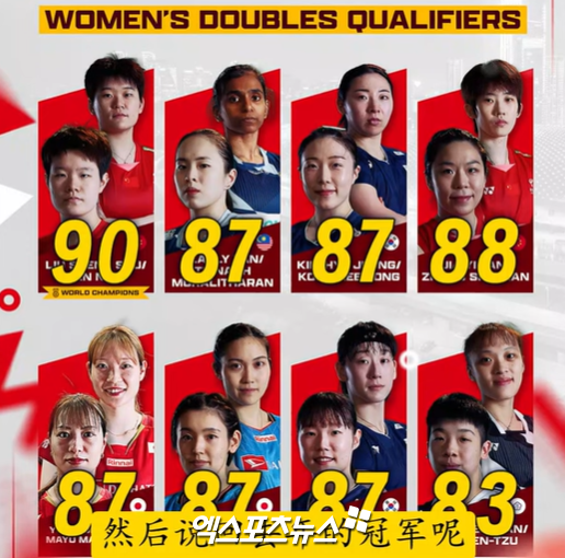 채널에 따르면 안세영이 91점이며 왕즈이와 지난 8월 프랑스 파리 세계선수권대회에서 금메달을 따낸 야마구치 아카네(일본·세계 3위)가 나란히 89을 얻었다. 야마구치는 지난 9월 코리아오픈에서 안세영을 한 차례 이긴 적이 있다.