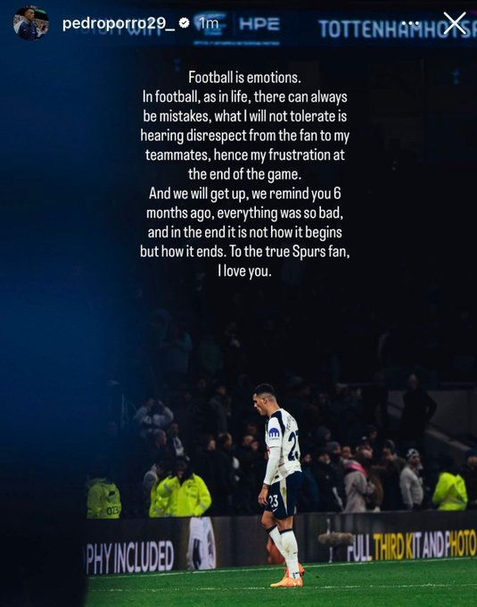 포로는 또한 "6개월 전만 해도 상황이 매우 나빴다. 중요한 것은 시작이 아니라 마무리다. 진정한 토트넘 팬에게 사랑을 보낸다"고 덧붙였다.