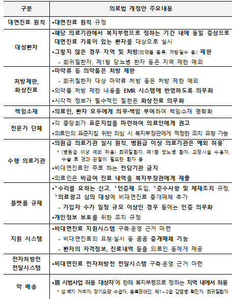 이번 의료법 개정안에는 ▲대면진료 원칙 ▲의원급 의료기관 중심 ▲재진환자 중심 ▲전담기관 금지 등 4대 원칙을 고려하면서 기술 발전을 고려해 법을 유연하게 조정했다.