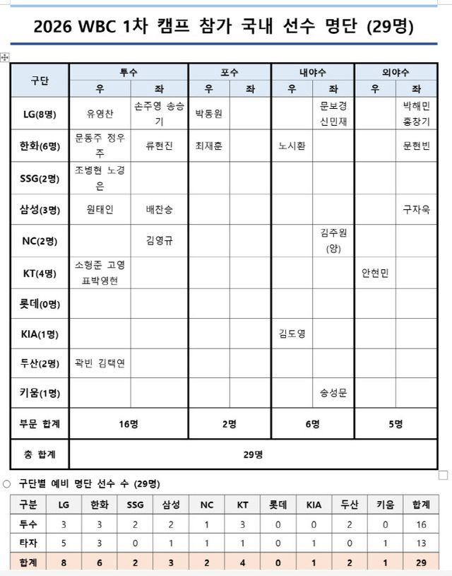 KBO는 3일 “2026 WBC를 대비한 대표팀 1차 캠프 참가 선수들을 확정했다”며 “투수 16명, 야수 13명 등 총 29명으로 구성됐다”고 밝혔다.