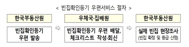빈집확인등기 서비스는 실태조사 업무를 수행하는 한국부동산원이 추정 빈집에 확인 등기를 발송하고 지역 우체국 집배원이 해당 주택을 방문해 외관 상태와 거주 여부 등을 확인한 뒤 체크리스트를 작성해 회신하는 방식이다. 이를 토대로 한국부동산원은 실제 빈집으로 판단되는 주택에 조사원을 파견해 빈집 확정 및 등급 판정을 위한 현장 조사를 실시한다.