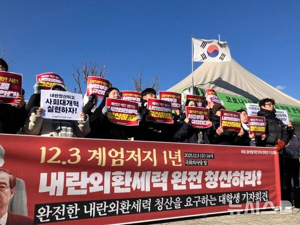12·3 비상계엄 사태 1년을 맞은 3일 대학생들이 국회 인근에서 집회를 열고 내란세력 완전 청산을 촉구했다.