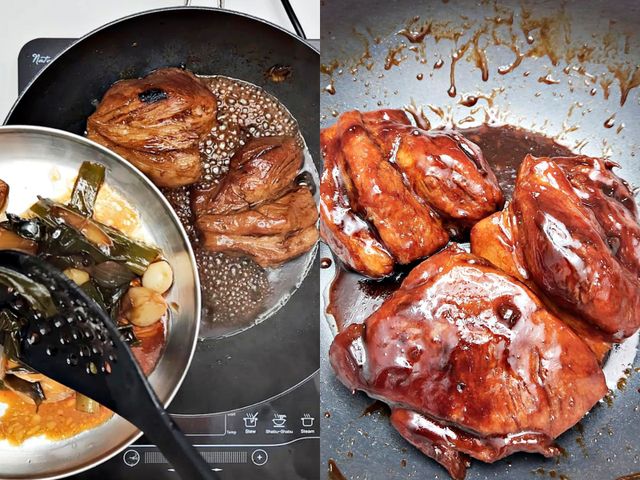 양념이 자작하게 졸아들면서 고기 표면에 윤기가 돌기 시작해요.