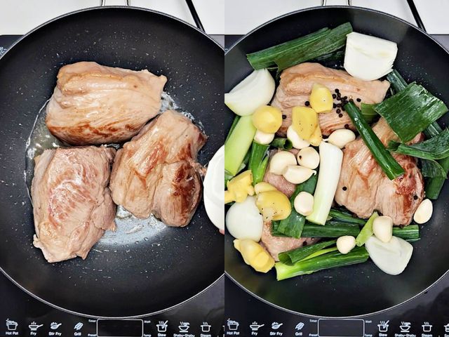 함께 넣을 재료로는 양파, 대파, 통마늘, 생강 준비했고요.
