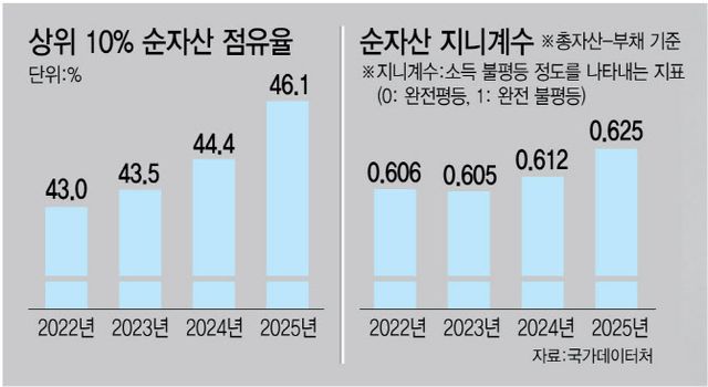 다만 자산 증가는 상위층에 집중됐다. 순자산 상위 10%의 점유율은 46.1%로 전년보다 1.6%포인트 늘어 불평등이 더 심화했다. 순자산 지니계수도 전년 대비 0.014포인트 상승한 0.625로 나타나 통계 작성 이래 최고치를 새로 썼다. 이 지표는 소득이 어느 정도 균등하게 분배되는지 알려주는 지표로 0에 가까울수록 평등하고 1에 가까울수록 불평등한 분포를 나타낸다.