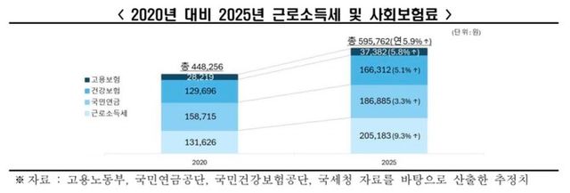같은 기간 월급에서 원천 징수되는 근로소득세와 사회보험료의 합은 월 44만8000원에서 59만6000원로 연평균 5.9% 늘었다. 세부적으로 보면 근로소득세는 연평균 9.3%, 사회보험료는 4.3% 증가했다.