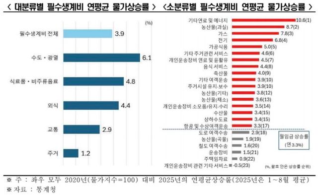 대분류별 상승률은 △수도·광열(6.1%) △식료품·비주류 음료(4.8%) △외식(4.4%) △교통(2.9%) △주거(1.2%) 순으로 높았다.