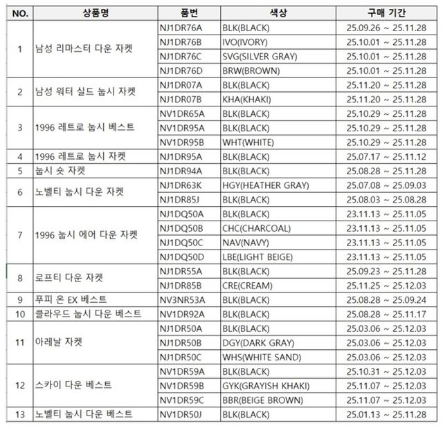 이번에 오기재가 확인된 제품은 △남성 리마스터 다운 자켓 △남성 워터 실드 눕시 자켓 △1996 레트로 눕시 베스트 △1996 레트로 눕시 자켓 △눕시 숏 자켓 △노벨티 눕시 다운자켓 △1996 눕시 에어 다운 자켓 △로프티 다운 자켓 △푸피 온 EX 베스트 △클라우드 눕시 다운 베스트 △아레날 자켓 △스카이 다운 베스트 △노벨티 눕시 다운 베스트 등 총 13개다.