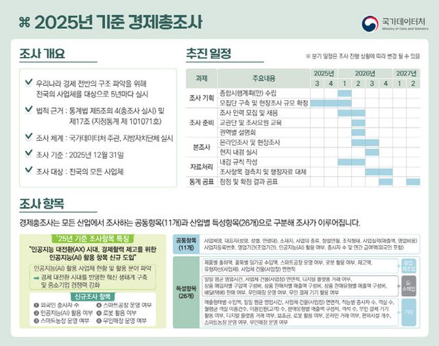 5년 주기 경제총조사(660억원)에서는 산업 환경 변화에 맞춰 AI 활용 여부, 외국인 종사자 수 등 신규 조사항목을 반영한다. 조사방식도 온라인 중심으로 전환해 조사 효율화를 꾀한다.