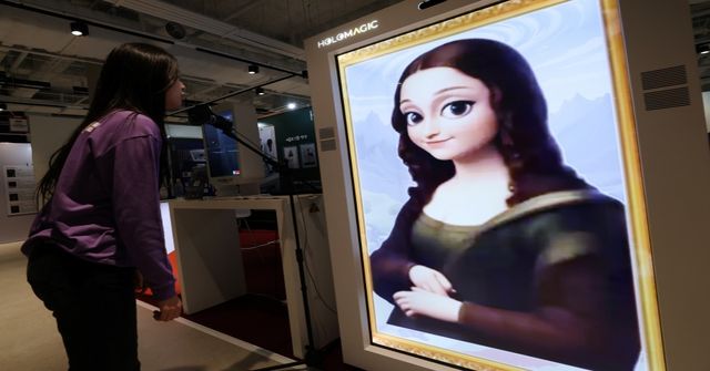 서울 강남구 코엑스에서 열린 'AI 콘텐츠 페스티벌 2025'에서 관계자가 AI 모나리자와 대화하고 있다. / 뉴스1
