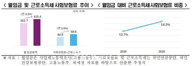 2020년 근로자 월 임금이 352만7000원에서 올해 415만4000원으로 올랐다. 이에 반해 월급에서 원천징수되는 근로소득세와 사회보험료는 2020년 월 44만8000원에서 2025년 59만6000원까지 늘었다. 임금 인상보다 과도하게 높은 근로소득세·사회보험료 탓에 임금 대비 비중은 12.7%(2020년)에서 14.3%(2025년)로 확대됐다.