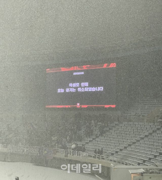 해당 관계자는 “선수단 입장 후 경기 진행하려고 했지만 안전상 경기 어렵다고 판단했다”며 “양 팀 감독과 코치진의 동의가 이뤄진 뒤 최종적으로 경기 감독관이 결정했다”고 설명했다.