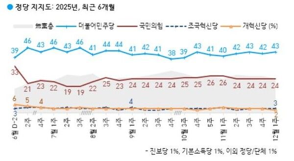 뉴시스 보도에 따르면, 한국갤럽이 지난 2~4일(12월 첫째 주) 전국 만 18세 이상 유권자 1000명을 대상으로 정당 지지도를 조사한 결과 민주당은 43%, 국민의힘은 24%로 집계됐다.