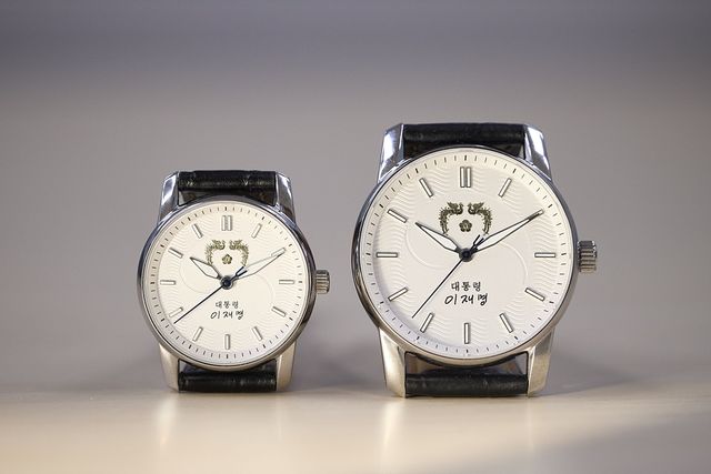 대통령실에 따르면 전통적인 대통령 손목시계와 마찬가지로 앞면에는 대통령 휘장과 함께 이재명 대통령의 서명이 들어갔으며 시계판 바탕에는 태극 문양이 새겨졌다. 손목시계 뒷면에는 이 대통령의 자필 글씨체로 '국민이 주인인 나라'라는 문구가 각인됐다.