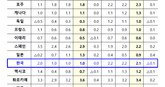 OECD는 한국의 경제 성장률이 2025년 1.0%에 머무를 것으로 전망했다. 2026년과 2027년에는 성장률이 2.1%로 다시 강화될 것으로 보인다. 소비자물가 상승률은 2025년 2.0%, 2026년 1.8%, 2027년 2.0%로 한국은행의 물가안정 목표치인 2%에 부합하는 범위에서 유지될 것으로 내다봤다.