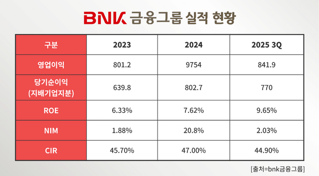 수익 구조의 은행 편중도 장기 과제로 꼽힌다. BNK금융의 이익 가운데 80% 이상이 여전히 부산·경남은행에서 발생하고 있다. 캐피탈·증권·저축은행 등 비은행 계열사의 이익 비중은 20% 안팎에 머물고 있다. 보험사 인수 등으로 포트폴리오를 넓히려 했지만 과거 제재 이력으로 인해 2026년 10월까지 신규 자회사 인수가 제한되는 점도 발목을 잡고 있다.