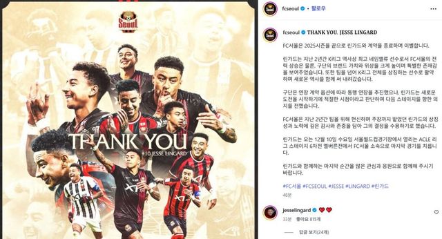 린가드의 고별전은 오는 10일 서울월드컵경기장에서 열리는 아시아축구연맹(AFC) 아시아챔피언스리그(ACLE) 리그 스테이지 6차전 멜버른과 경기다. 그는 서울 홈 유니폼을 입고 뛴다.