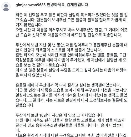 마지막으로, 제 선택과 과정으로 마음고생하셨을 두산베어스 동료들과 팬분들에게 다시 한번 진심 어린 감사와 사과의 마음을 전합니다.
