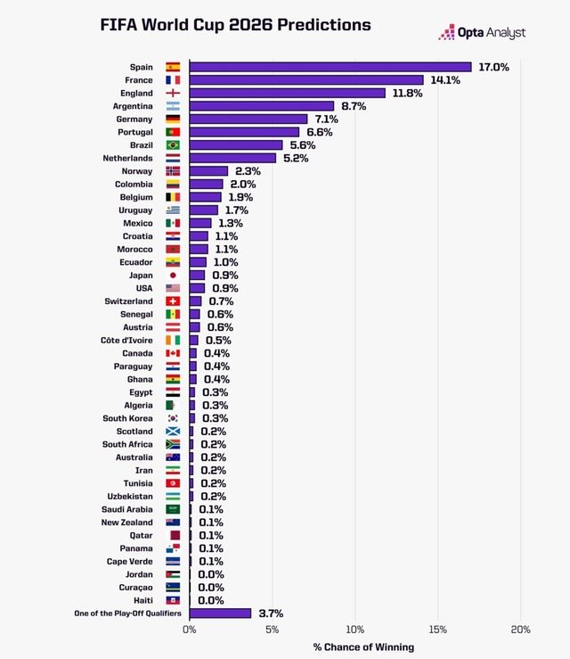 옵타는 스페인에 이어 프랑스(14.1%), 잉글랜드(11.8%), 아르헨티나(8.7%), 독일(7.1%), 포르투갈(6.6%), 브라질(5.6%), 네덜란드(5.2%), 노르웨이(2.3%), 콜롬비아(2.0%)를 2026 북중미 월드컵 우승 확률 톱10으로 꼽았다.