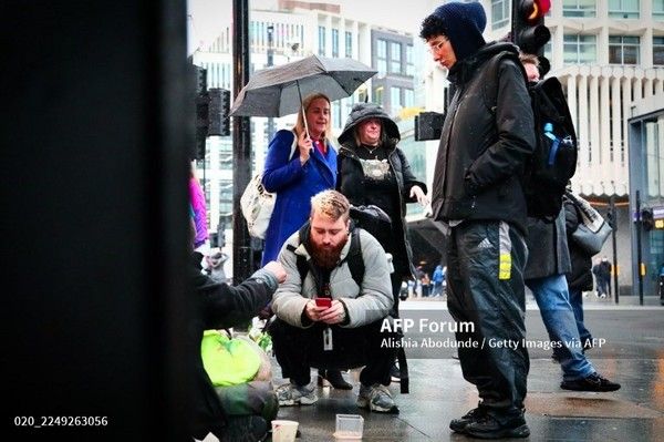 Outreach workers from The Connection, Harry (L) and Kezi (R), speak and offer help to a homeless man and his dog on Tottenham Court Road on December 4, 2025 in London, England. CITYPAK provides innovative, purpose-engineered rucksacks to help people experiencing homelessness and living on the streets. The backpacks have already been widely distributed to homeless communities across the USA and on Australia. In London CITYPAK operate alongside The Connection at St Martin-in-the-Fields, CRISIS and The Salvation Army, and other charities who work with homelessness. This Christmas, The Connection will transform their day centre into a night centre for London's rough sleepers