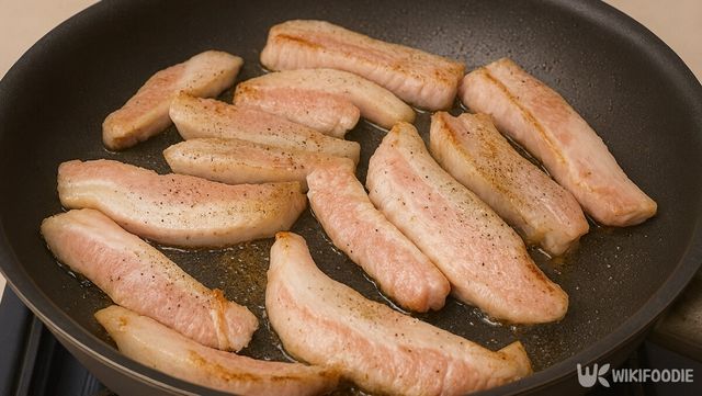 양배추를 볶은 팬을 그대로 사용한다. 팬 온도가 너무 높으면 항정살이 쉽게 탈 수 있어 불을 약간 낮춘 뒤 고기를 올린다. 소금과 후추로 간을 잡아 앞뒤로 굽는다. 항정살은 기름이 넉넉히 나오는 부위라 중불에서 천천히 익히면 속까지 고르게 익는다.